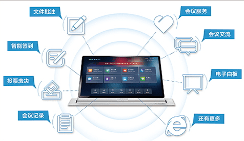 會議終端首頁界麵顯示會議名稱、座位號、姓名、職位,可快速找到對應未知進行會議簽到。終端可以查看到所會議一體內容,不同部門議題可針對部門開放查看權限。支持會議文件多窗口打開,可同時打開多個文件,多頁麵顯示。文件演講同時,可隨時快捷調出電子白板進行演示操作。會議文件閱覽支持在線原文檔修改並保存副本,支持畫板批注,多人批注。可同步廣播,會議資料一鍵廣播給其他參會人員或大屏幕可對原始資料及時修改保存。還可進行投票表決;視頻播放;會議服務(與會者在匯總想服務台個性化呼叫茶、水、筆、紙等服務);會議交流;會議主持等。
